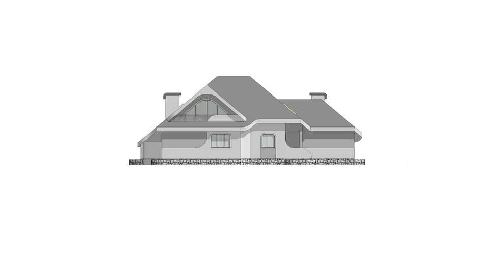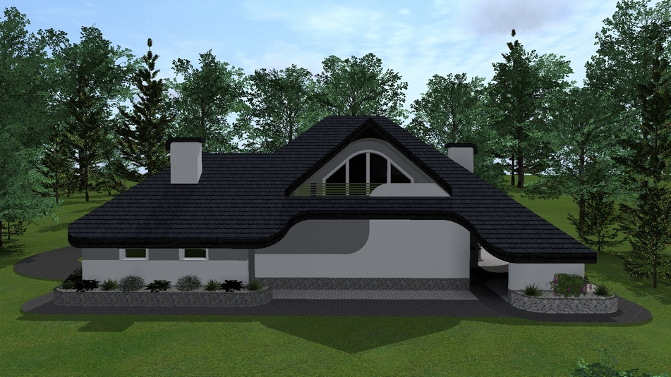W założeniu projektu na powierzchni parteru układ funkcjonalny obejmuje pokój dzienny z dużym oknem umożliwiającym wyjście na zewnątrz budynku, a także optycznie powiększającym przestrzeń, kuchnia ze spiżarnią, a także łazienka. Ponadto na parterze wydzielono niewielką zamkniętą przestrzeń, którą wykorzystać można jako pokój do pracy lub pokój gościnny. Na paterze zlokalizować można także schowek, wygospodarowany pod schodami, który z pewnością ułatwi utrzymanie porządku. Na bocznej części budynku zaprojektowano garaż z jednym stanowiskiem, a także kotłownię z osobnym wyjściem, które zlokalizować można w tylnej elewacji budynku. Na piętrze zaprojektowano cześć prywatną na którą składają się trzy sypialnie (dwie z balkonami) i wspólna łazienka. Niewątpliwą zaletą projektu jest podcień wypoczynkowy z grillem, który zapewne ułatwi integrację rodziny w momentach odwiedzin, zwłaszcza,że znajduję się w bezpośrednim sąsiedztwie z pokojem dziennym. Ponadto zaletami projektu są także zintegrowana przestrzeń budynku i wokół niego, na którą składają się elewacje, układ kostki, zieleń przydomowa, a także finezyjnie wyrzeźbiona bryła dachu.