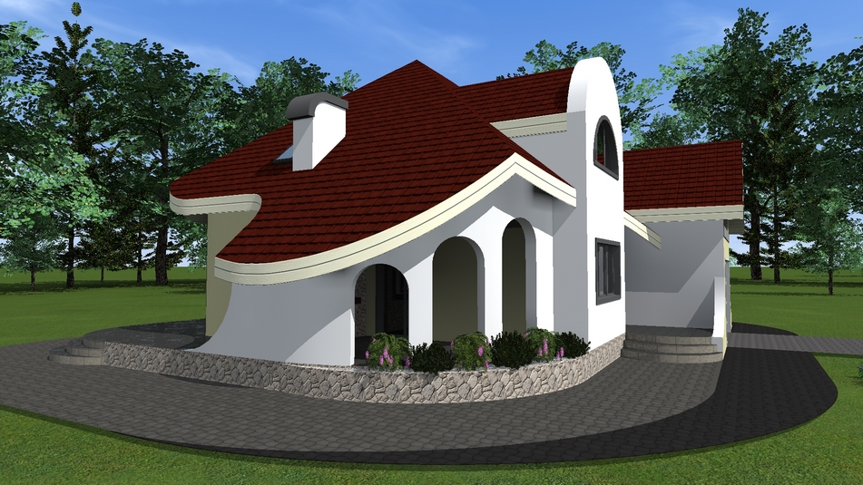 Cechą wyróżniającą projekt spośród innych jest finezyjnie zaprojektowany dach o nietypowym kształcie, który zapewnia efektowny wygląd budynku oraz zadaszenie dla przestrzeni użytkowych na zewnątrz domu.Jest to projekt o spójnej formie. Dzięki opływowym kształtom jest przyjemny dla oka.