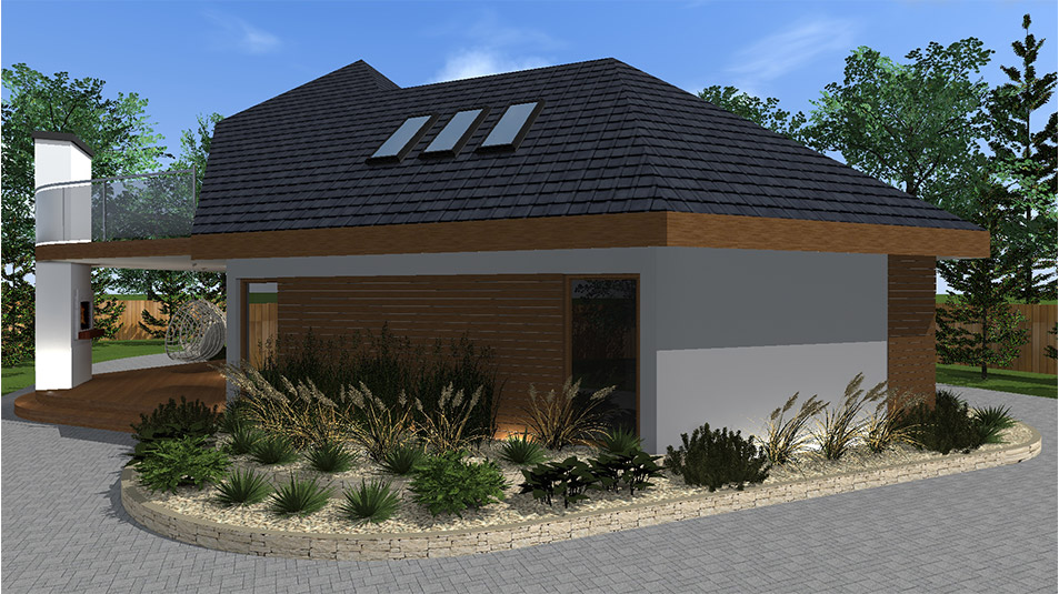 Projekt domu JAŚMIN to oryginalna propozycja wygodnego domu na optymalnym metrażu z przyległym do niego wygodnym tarasem. Na parterze w otwartej strefie dziennej znajduje się imponujący salon i otwarta kuchnia ze spiżarnią. Ponadto, znajdziemy w nim także łazienkę i garderobę. Na poddaszu zaproponowano podział strefy nocnej na cztery sypialnie, toaletę i garderobę. Budynek oraz przyległe do niego pomieszczenia zostały przykryte wielospadowym dachem kopertowym i nawiązuje do stylu nowoczesnego. Charakterystycznie zaprojektowana elewacja z elementami drewna, w połączeniu z otoczeniem budynku pozostawia po sobie przyjemne doznania wzrokowe, gdyż elementy te tworzą niezwykle spójną całość.